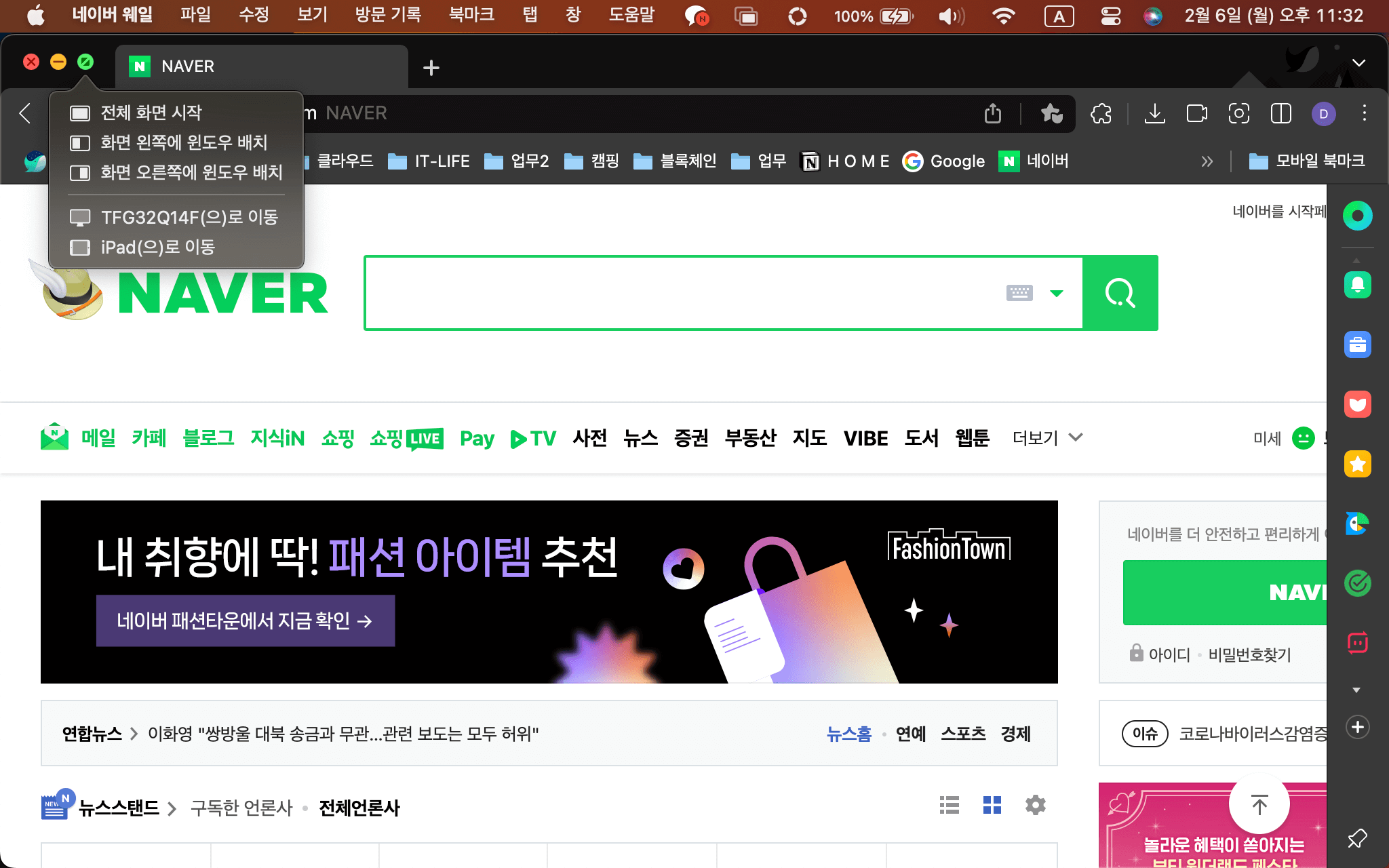 전체화면 되지 않은 창의 좌측 상단 초록색 버튼을 꾹 누르고 계시면 창을 공유하는 메뉴를 통해서도 사이드카를 활용하실 수 있습니다.