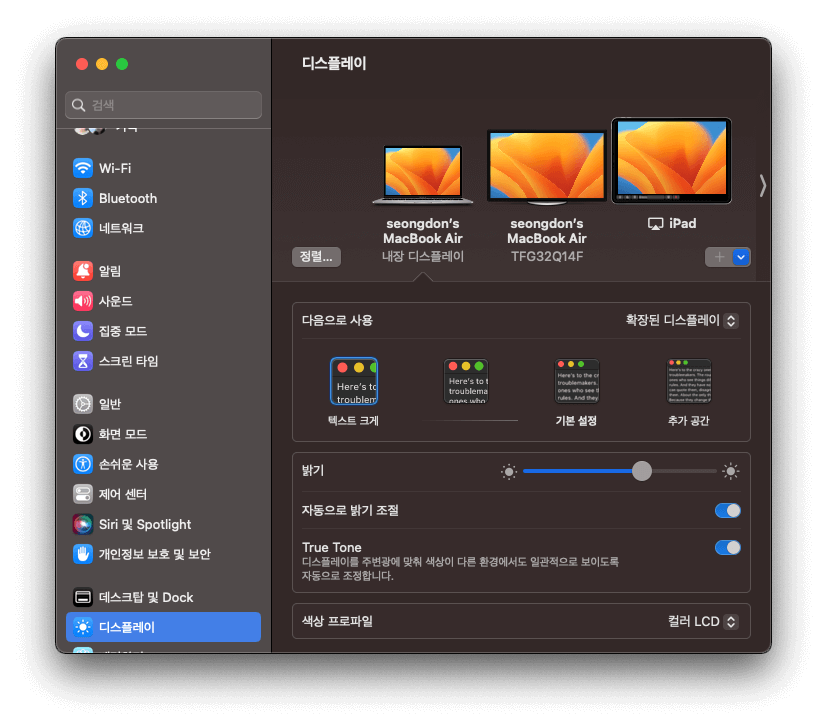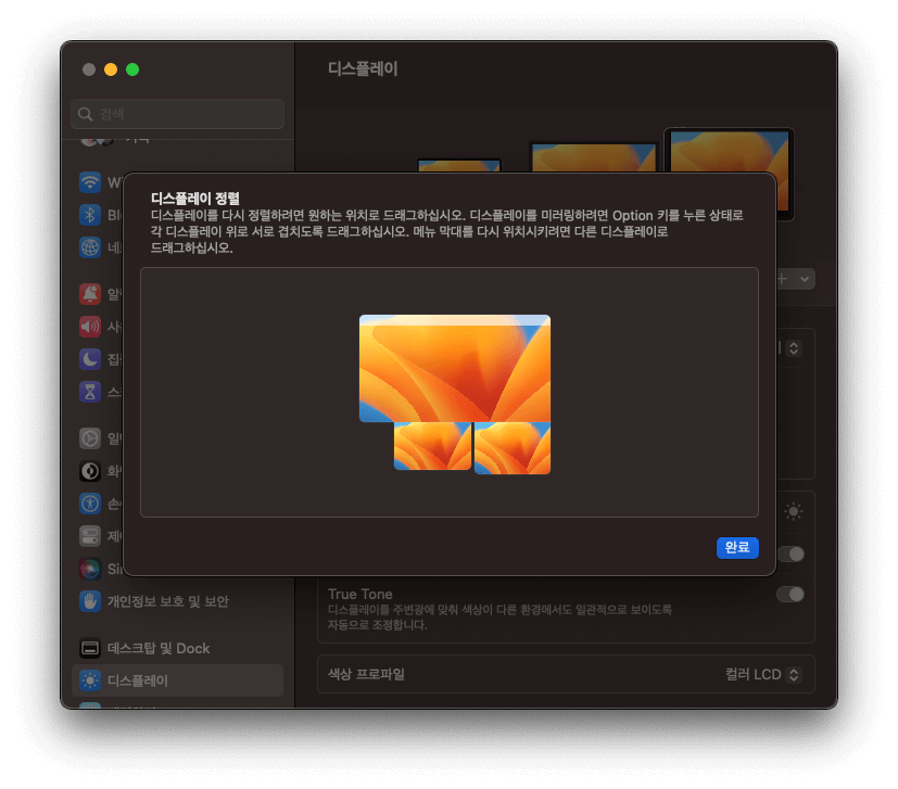 디스플레이 설정 메뉴를 통해 연결 여부를 확인하실 수 있고, 모니터의 배치를 원하시는 위치로 변경 가능합니다.