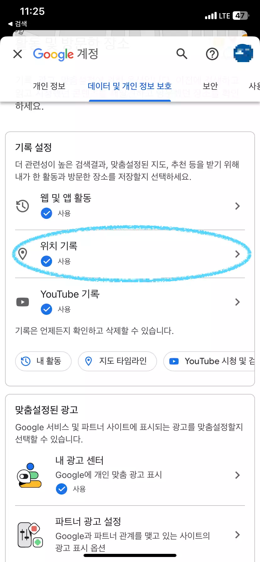 - 아래로 내려와 위치 기록 메뉴를 사용으로 설정해 주시기 바랍니다.