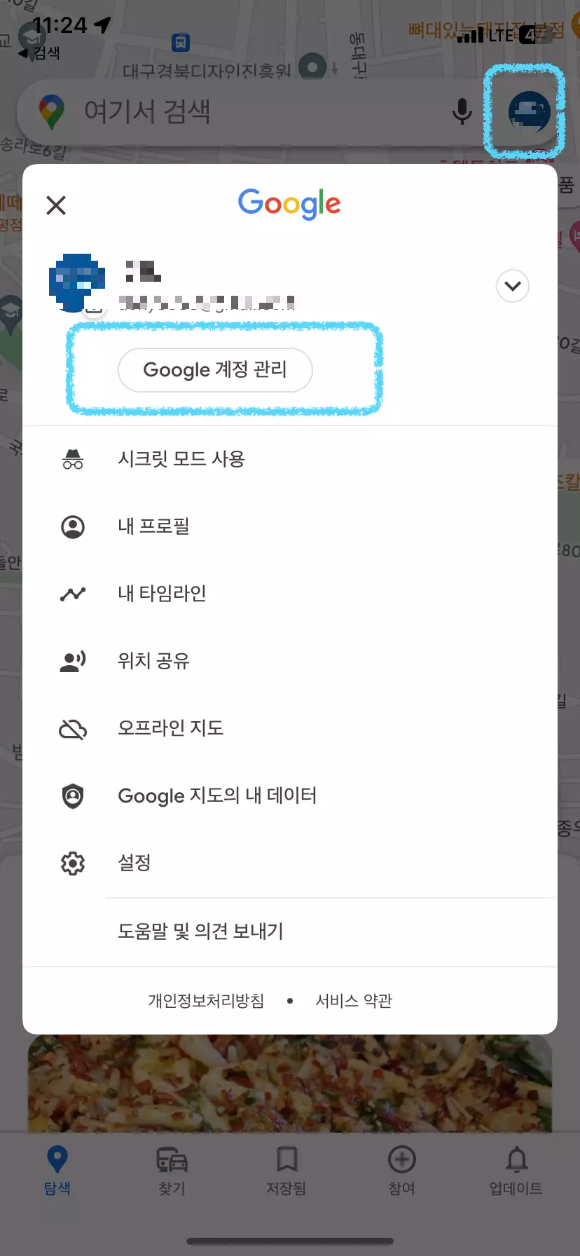 - 구글맵의 설정창이 나타납니다. 그곳에서 "google 계정 관리" 버튼을 클릭 해 줍니다.
