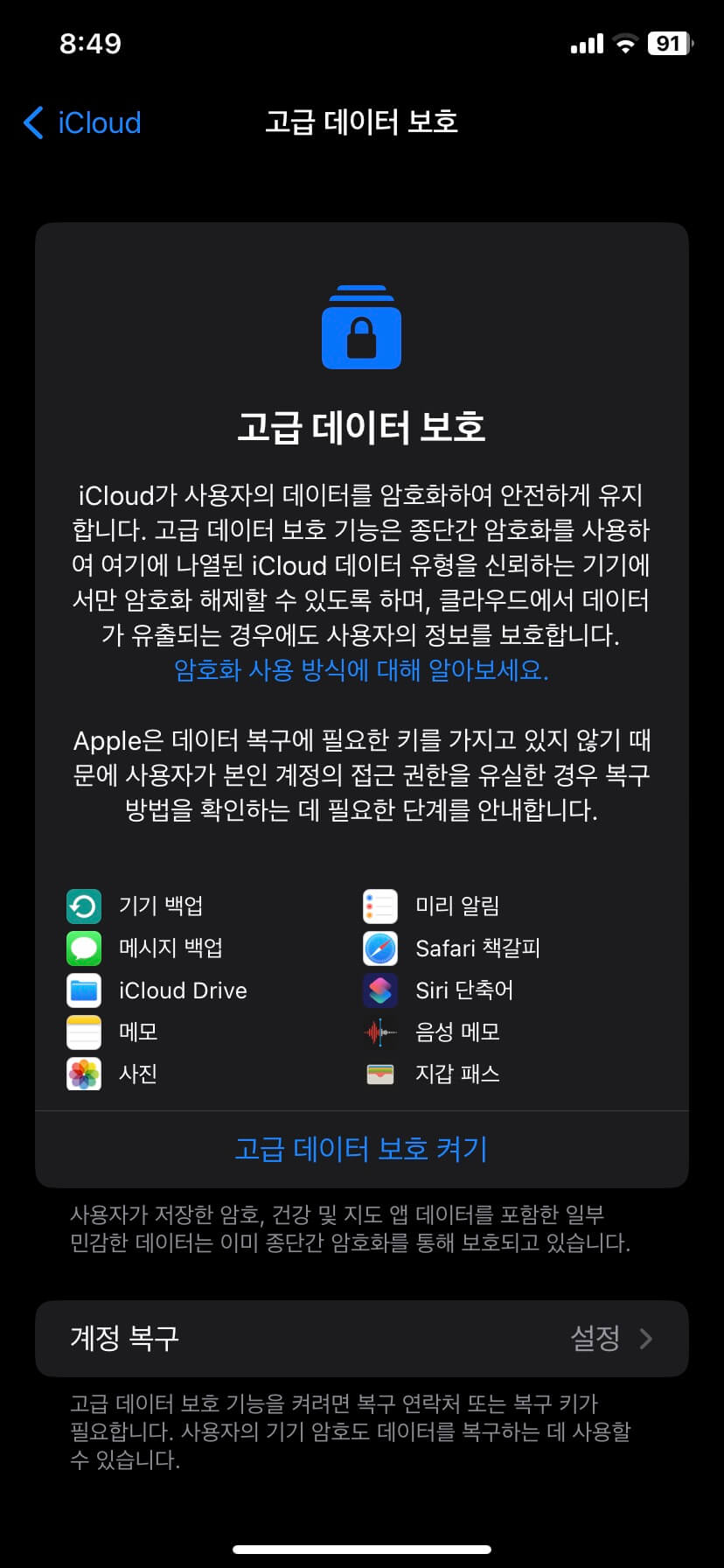 - [설정-애플아이디 설정-iCloud-고급데이터보호]을 통해 설정이 가능합니다.