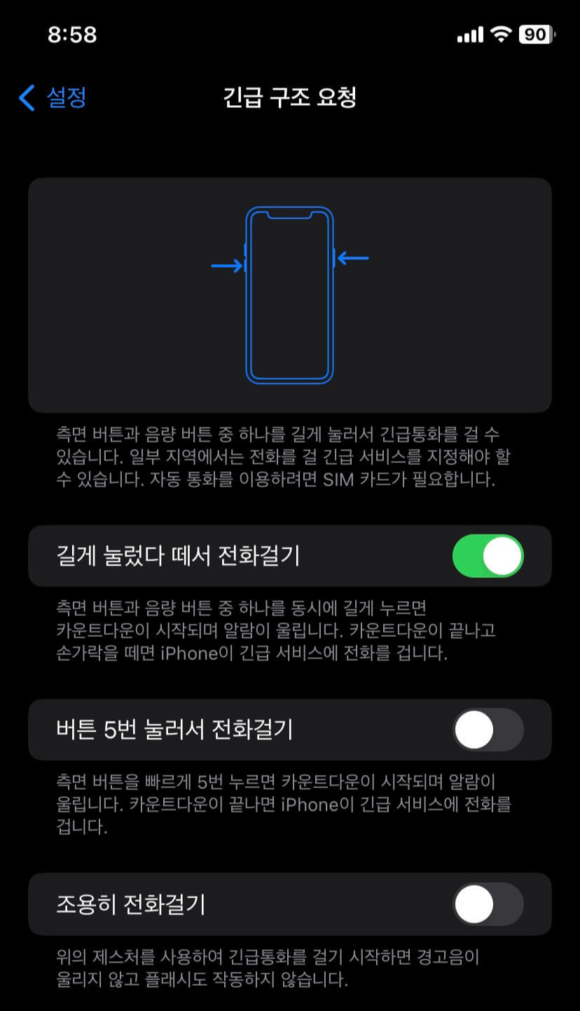 - 측면 버튼과 음량 버튼 중 하나를 길게 누르면 카운트다운이 시작되며 알람이 울립니다.